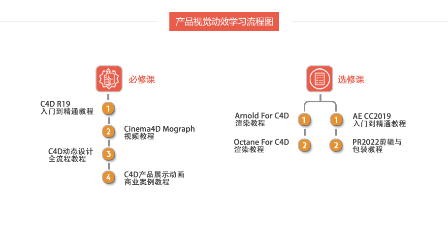 产品视觉动效师的学习计划是以C4D为主轴,通过学习C4D产品建模,材质包装,以及设计动画,再渲染分镜头。最后再通过AE和PR的配合制作出充满动感,体现产品特征的视觉作品。满足各种产品宣传销售场景的展示。