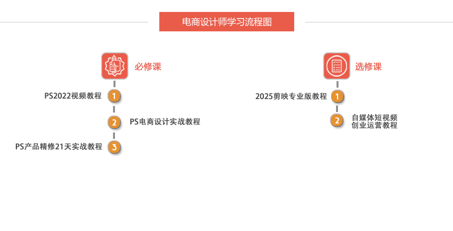 电商设计学习流程;全面系统的进行学习,开拓思维,实现质变,能够独立完成整套设计,掌握电商设计的核心知识。