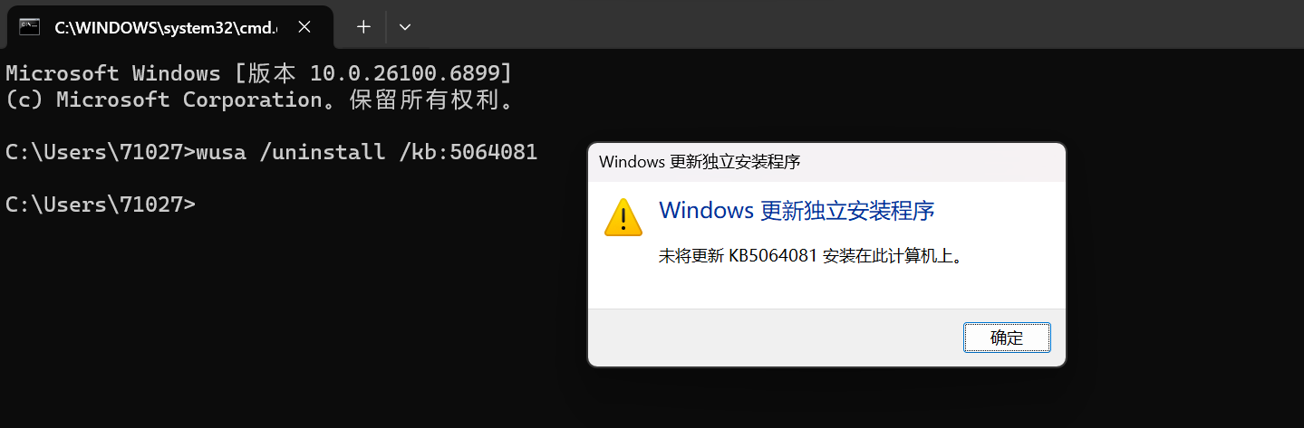 @ T595565nl 方法二:通过「命令提示符」卸载更新 1. 按 Win + S 搜索框输入 cmd,右键选择「以管理员身份运行」。 2. 在命令行中输入以下指令并执行: wusa /uninstall /kb:5064081 3. 系统会提示是否确认卸载,选择 “是”。 4. 等待完成后,重启电脑。 T595565nl