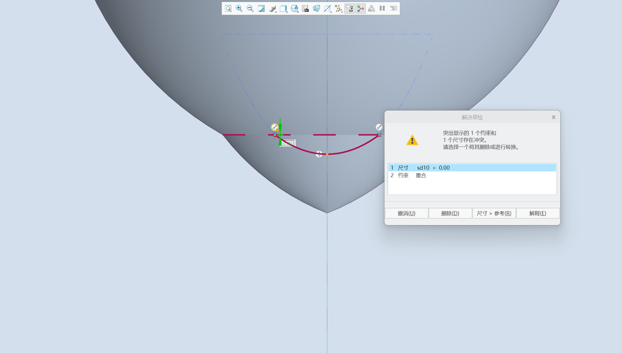 老师,为什么花样条线这里,我想标注180度这个尺寸无法标记,显示冲突了
