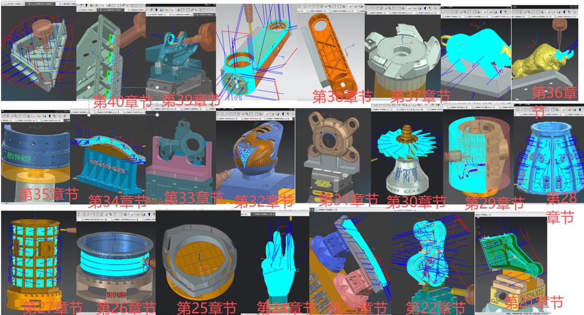 大家好,我是本教程的讲师,课程先做一个简单介绍:前20章节是四轴案例,后20章节是五轴案例,四轴第一个案例,因为是第一次做教程,反复的录,比较紧张,感觉做的可能不是那么完美,如果有讲的不好的,希望大家多多海涵包容,第二个之后就比较放得开了,如果觉得第一个讲的不好,可以破费看看第二个或者后面的,可能会好很多,下面是后20章节,五轴案例截图,方便大家学习。有问题可以讨论区留言,互相沟通学习交流。