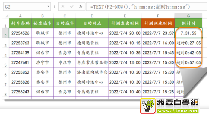 如下图所示,是某快递公司车辆运输表的部分内容。其中F列是计划到达时间,希望在G列得到这样的效果:
