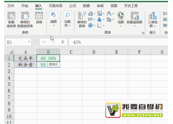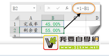 B1单元格中输入完成率,B2单元格中输入公式计算剩余量: