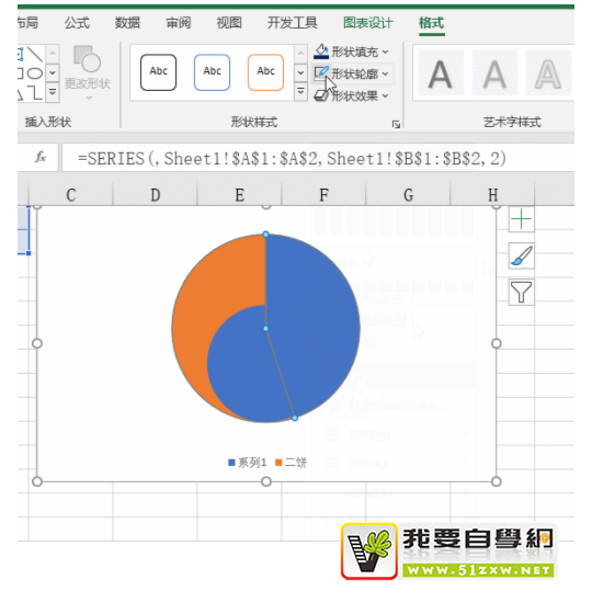 依次单击饼图的两个系列,设置形状轮廓为“无轮廓”