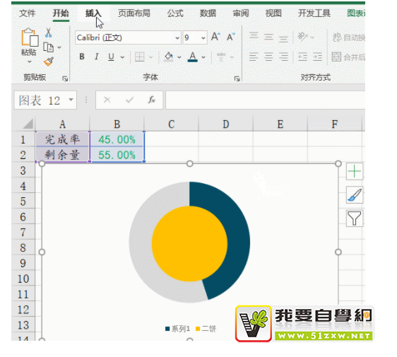 保持文本框的选中状态,在编辑栏中输入等号,然后单击B1单元格中的完成率,按回车。