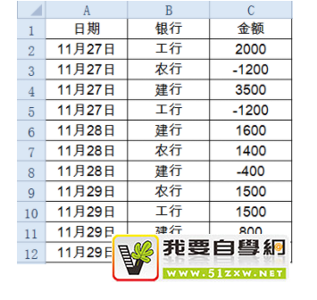 依次将日期、银行和金额字段添加到行标签区域,将金额字段拖动到数值区域。