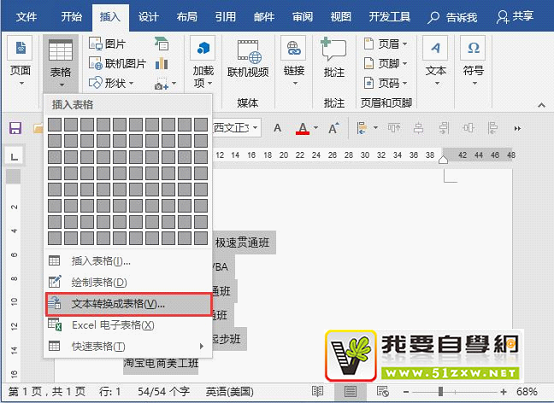 (1)选中文本,点击【插入】-【表格】按钮,在弹出的菜单中选择“文本转换为表格”命令。