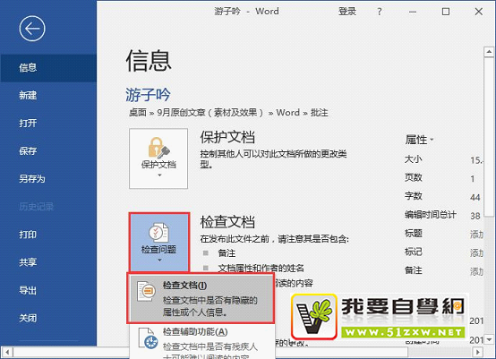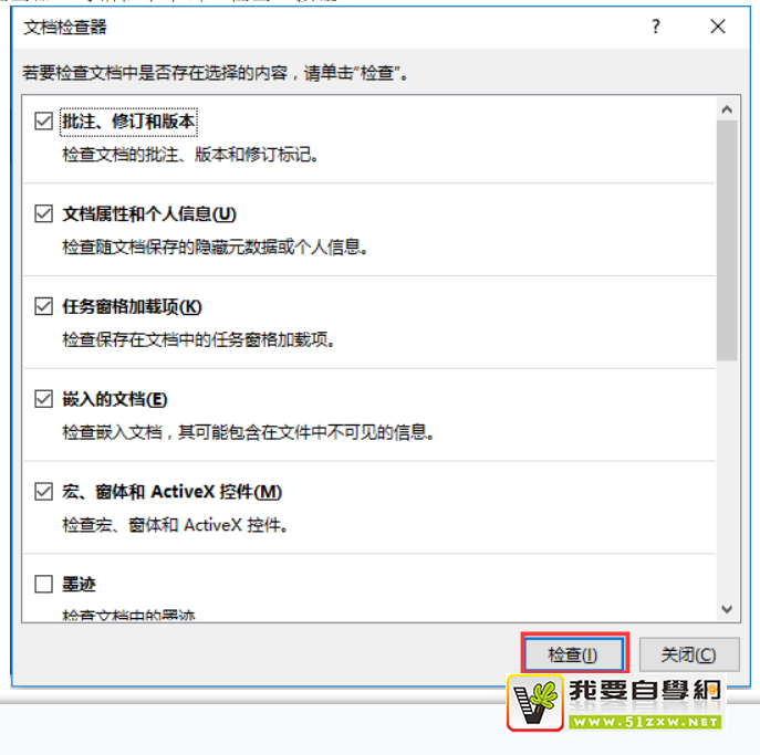 (2)在打开的”文档检查器“对话框中单击”检查“按钮。