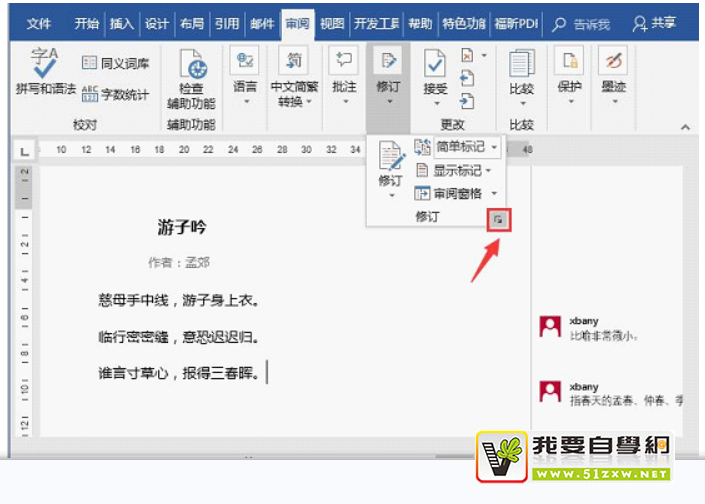 (1)点击【审阅】-【修订】组右下角的“对话框启动器”按钮。