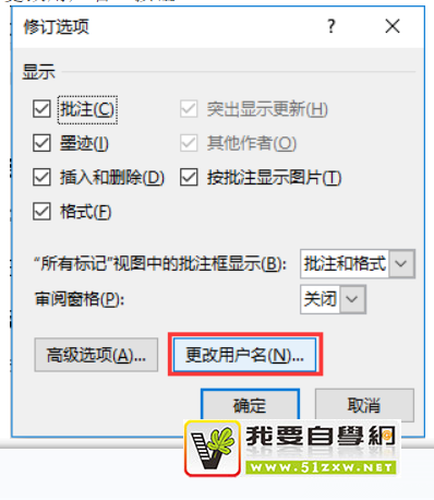 (2)打开“修订选项”对话框,单击“更改用户名”按钮。