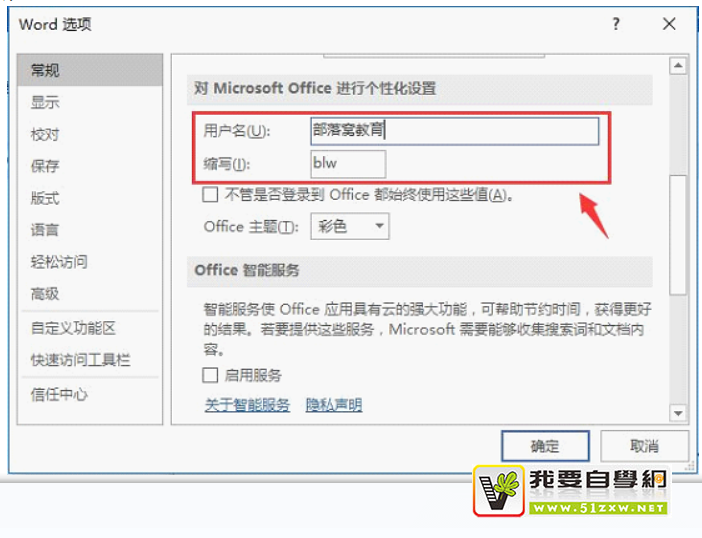 (3)打开“Word选项”对话框,选择“常规”选项卡,在“对 Office 副本进行个性化设置”栏下,更改您要在自己的批注中使用的姓名或缩写。