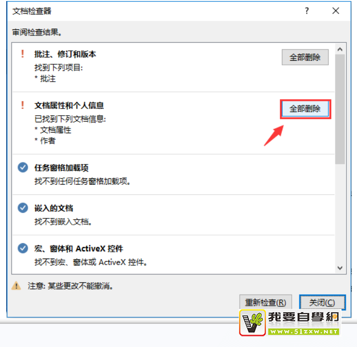 (3)此时,即开始对文档进行检查。检查完毕后,单击”文档属性和个人信息“右侧的”全部删除”按钮。