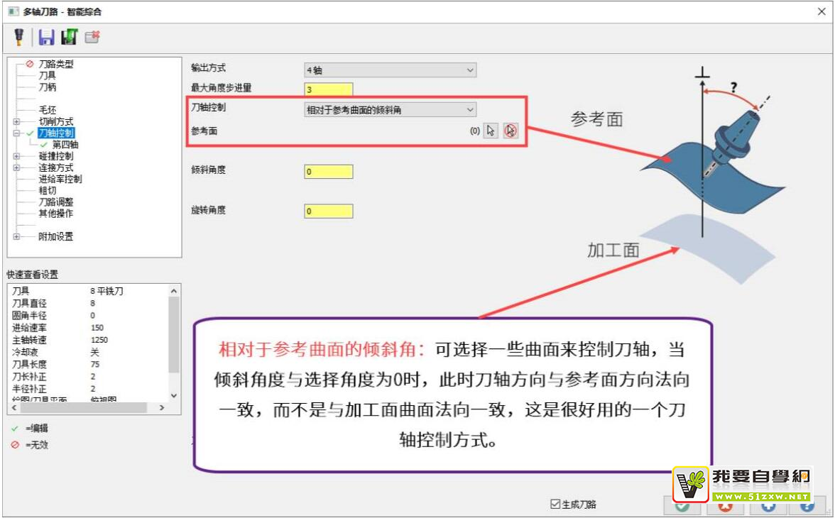 相对于参考曲面的倾斜角:可选择一些曲面来控制刀轴,当倾斜角度与选择角度为0时,此时刀轴方向与参考面方向法向致,而不是与加工面曲面法向一致,这是很好用的一个刀轴控制方式。