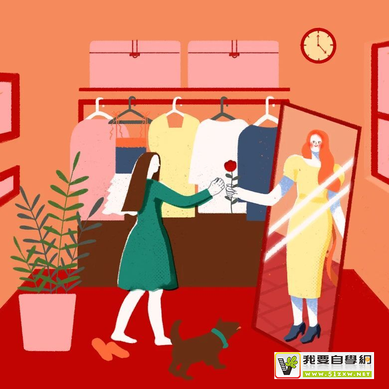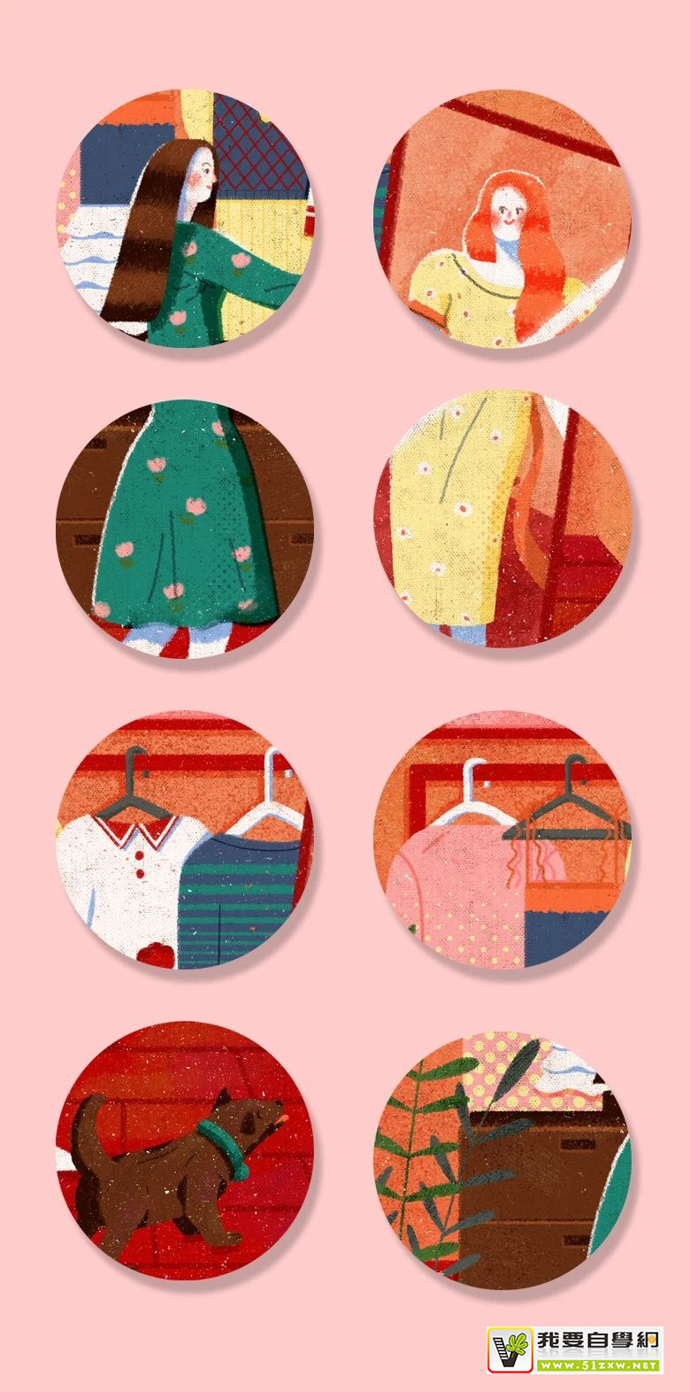 我最开始的灵感来源,是擅长手绘稚拙风格的插画师Alisa Yufa的一张作品,是关于一个微胖女生、她的猫和她的衣橱的小故事。