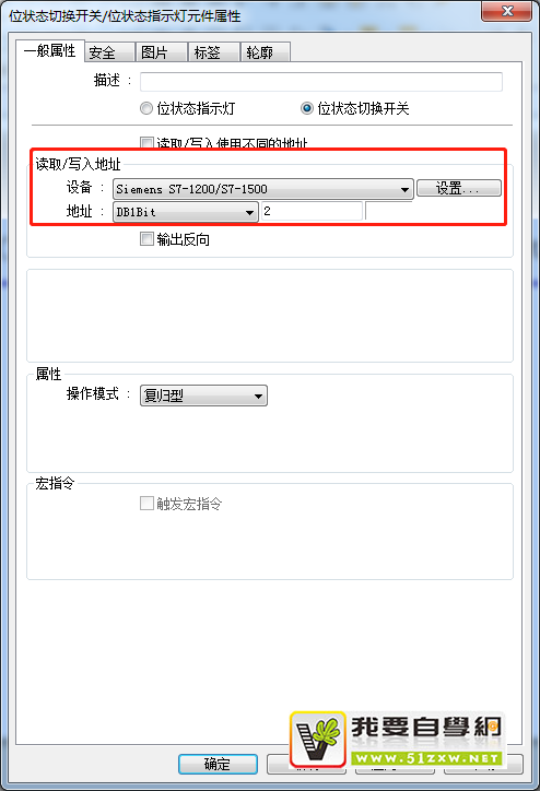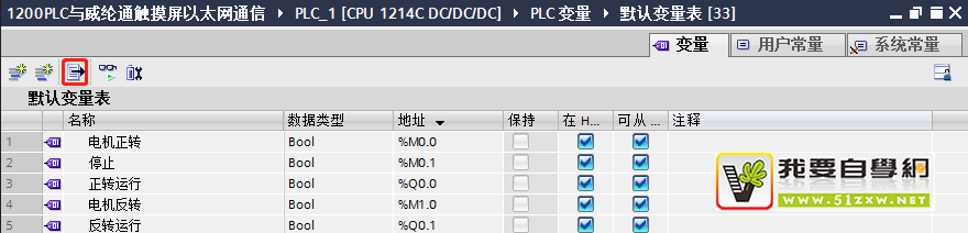 反转启动地址S7-1200PLC:1.DBX0.1对应威纶通触摸屏:DB1Bit1