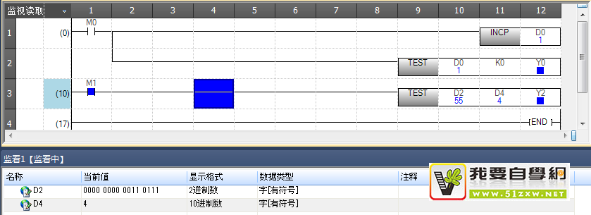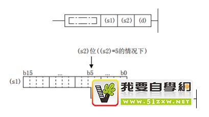 测试指令TEST/DTEST是从s1中指定的软元件开始,提取s2中指定的位置的位数据后,写入到d中指定的位软元件中。对于TEST指令,在s2中,指定1字数据的各个位位置(0~15)。s2中指定了16以上的情况下,s2÷16的余数值将变为位位置。对于DTEST指令,则s2÷32的余数值将变为位位置。比如s2=20时,20÷16=1余4,因此变为b4的数据。