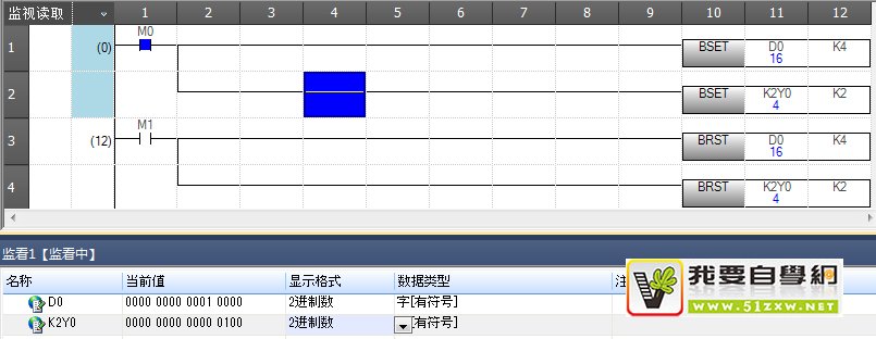 字软元件的位设置、位复位指令其实就跟置位SET和复位RST指令是类似的,区别就在于BSET和BRST可以指定某个字软元件地址中的某个位,并进行置位和复位。BSET是对指定的字软元件的第n位进行置位,BRST是对指定的字软元件的第n位进行复位。需要注意的是位设置的位数范围为0~15,超过了15的情况下,是以低位4位的数据执行。