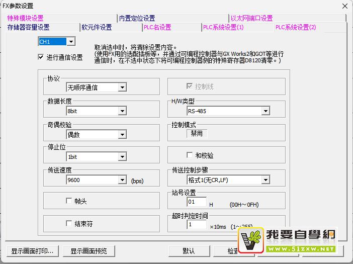 协议采用无顺序通讯 数据长度8bit 偶校验 停止位1位 传送速度设置9600 类型设置成485,站号设置成1站