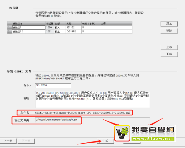 下面的步骤是导出200SMART的GSD文件。首先点击浏览按钮,选择放置生成的GSD文件的文件夹,如下图4中选择的桌面的GSD文件夹;然后点击导出按钮,最后一定记得还要点击生成按钮。注意,当你在博图中做过多次配置200SMART做IO设备的项目时,切记要将本次生成的GSD文件名系住。因为200SMART的GSD文件名都很相似,在博途中选错了是没法建立通信的。本次的文件名如图中的红色方框内所示: