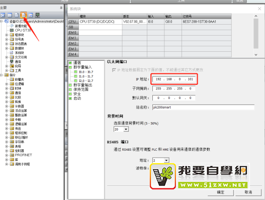 200SMART编程软件自V2.4版本、CPU固件也是自2.4版本起起开始支持Profinet通信。200SMART即可以做IO控制器,也可以做IO设备。下面的例程以200SMART做IO设备举例。首先打开软件建立一个名为“设备IO”的项目,点击“系统块”,在弹出的对话框中设置IP地址,我这里设置的是192.168.0.101,与实物PLC一致。如下图1所示: