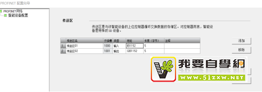 将默认的SBR0子程序重命名为配方处理,建立一个带参数的子程序。在变量表中建立相应的接口参数,程序编辑区编写配方处理程序,在下一步的画面中配置传输区,即和1200PLC的数据交换区。可通过“添加”、“移除”按钮来增加或移除输入输出传送区。注意:这里的输入和输出起始地址IB1152、QB1152不能更改,且输入输出传送区最大长度为128个字节,地址和长度出错均会报错。为测试方便,我配置了5个字节,如下图3所示:
