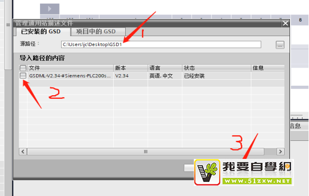 安装GSD文件。点击菜单-选项-管理通用站描述文件(GSD),在弹出的对话框中按下图6中的1、2、3步骤操作,即可安装好GSD文件。注意:图中步骤1源路径选择放置GSD的文件夹。当选好后,相应的GSD文件会显示在“导入路径内容”的列表当中,勾选后点安装即可。如下图6所示: