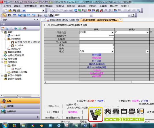 在GX Works2中新建工程,选择Q02U CPU,在参数中的网络参数的以太网等等,选择模块1,具体设置如下图: