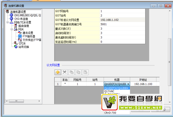 机种就选第一个,然后往下拖,有个以太网设置,机器选择QJ的那个。这里顺便把IP地址,站号,网络号,端口号的一设置就ok了。GOT设置结束。