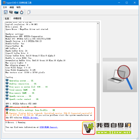 13,关闭后系统自动弹出系统检测页面。如有红色X子的就是不能正常使用,和软件和加密狗 没任何关系,请自行去下对应的显卡驱动。叹号的忽略。