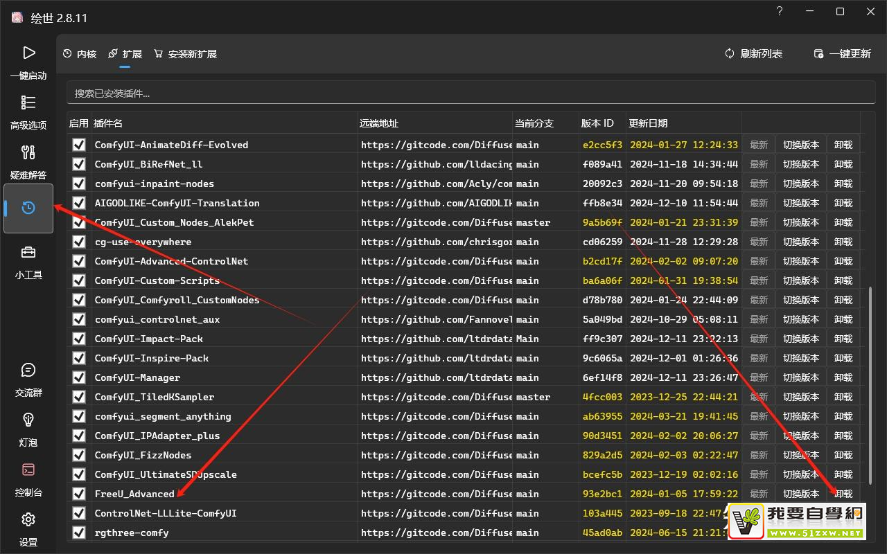 - 打开启动器——“版本管理”——“扩展”找到“FreeU_Advanced”扩展,将其卸载。