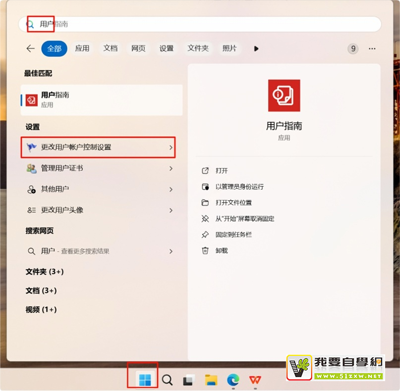 点开WIN图标,搜索用户,找到更改用户账户控制设置。