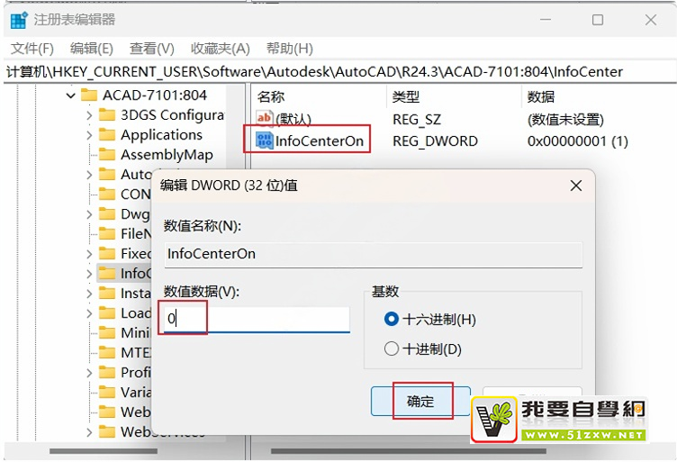 弹出【注册 表 编 辑 器】窗口,如图 注册 表 编 辑 器所 示,找 到如下 路 径“计 算机\HKEY_CURRENT_USER\Software\Autodesk\AutoCAD\R24.3\ACAD-7101:804VInfoCenter"双击InfoCenterOn,弹出【编辑DWORD(32位)值】对话框,如图编辑DWORD(32位)值所示,将数值数据改成0,单击【确定】按钮,这样就屏蔽了AutoCAD通讯中心。