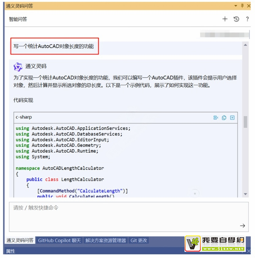 登录之后直接问通义灵码,写一个统计AutoCAD对象长度的功能。
