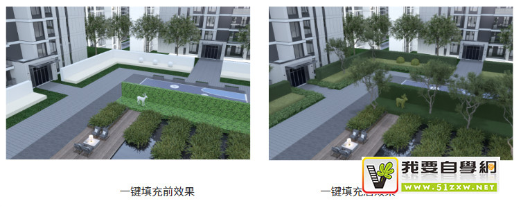 1. 素材选择: 在线库中“素材库” -> “自然” -> “绿篱”分类里新增多种叶片材质,名称中包含“单丛”适用于配合散布功能达到绿篱效果。