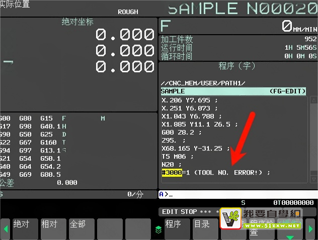 其实这个问题比较简单,宏程序报警的写法是相同的没有变化,#3000=1 (TOOL NO. ERROR!),如下图: