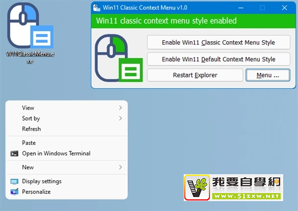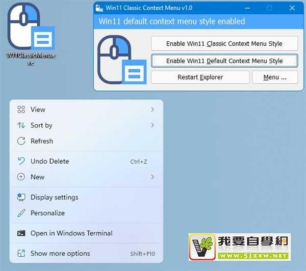 注册表的操作比较复杂,没有经验的朋友容易出错,藉此我们也可以利用一些软件进行修改。例如这款“Windows 11 Classic Context Menu”。