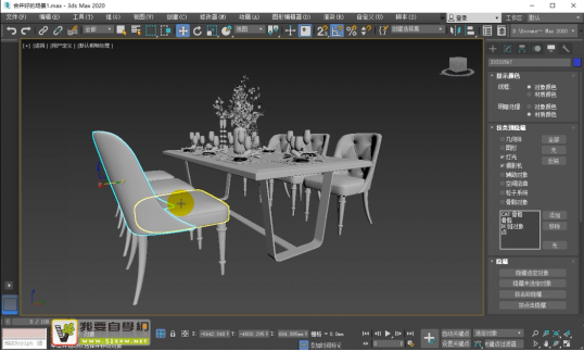 步骤1:选择上简欧风格3D场景中的餐椅,然后Alt+Q把餐椅单独孤立出来,然后解组(视频解组快捷键设置为Ctrl+D)。