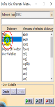 步骤9:点击下图“Members of selected dictionary”中的DOF(1),在“Selected Joint”下就会自动填写上DOF(1),如图中光标所示。这样的填写关系意思是:时针和分针之间建立的一个步调完全一致的运动关系。