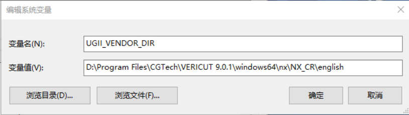 变量值:D:\Program Files\CGTech\VERICUT 9.0.1\windows64\nx\NX_CR\english