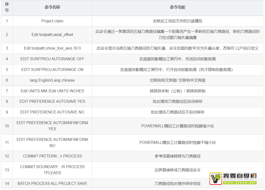 下表列出了Powermill系统的一些常用和实用命令。应用这些命令的路径是在PowerMill的下拉菜单中执行工具-显示命令,打开Powermill命令操作窗口输入命令即可实现对用功能。