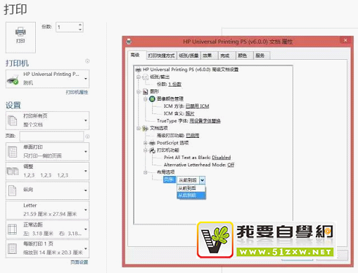 在打印预览界面,点击“打印机属性”。在弹出的对话框中切换到“高级”选项卡,将最后一项页序设置为“从后到前”,然后点击“确定”按钮保存设置即可。从而打印完后所有的页是顺序排列的。