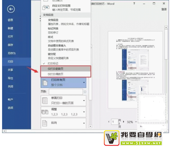 单击“文件”-“打印”,在“设置”列表框中选择“奇数页”选项或“偶数页”选项即可。