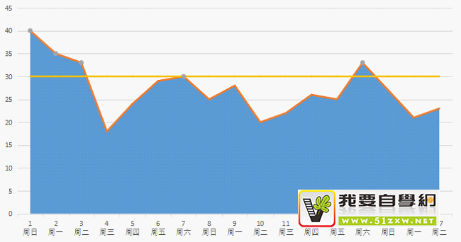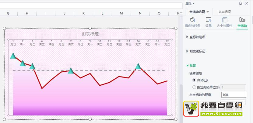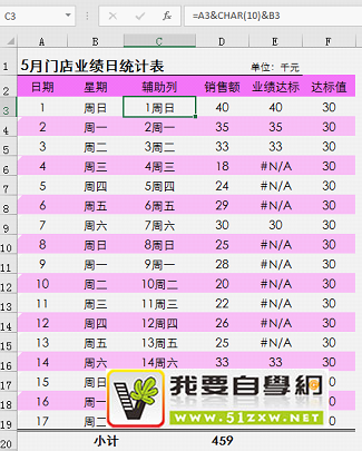 该辅助列将日期和星期合成一个值并强制显示为两行作为横坐标轴值。公式=A3&CHAR(10)&B3,其中 CHAR()是一个字符函数,括号内不同的代码代表不同的字符,CHAR(10)代表换行符。