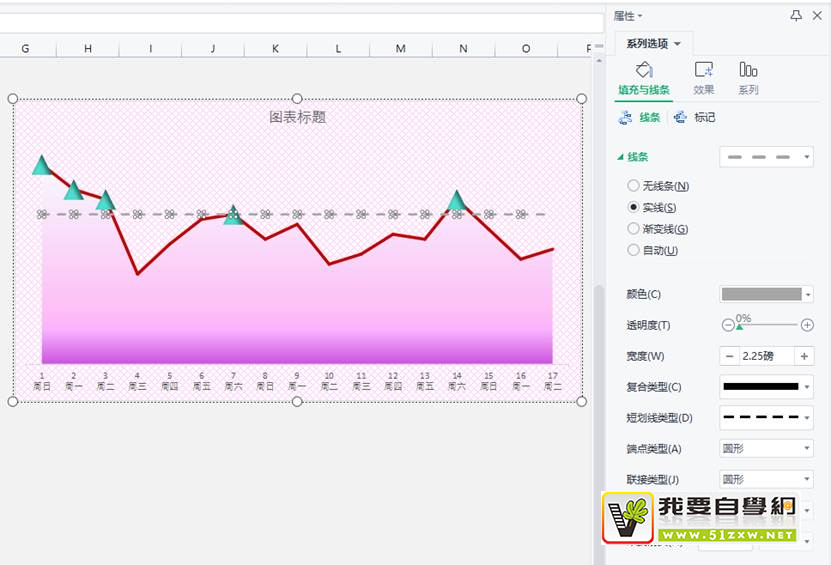 点击折线图,线条设置成实线,深红色,宽度3磅,如下图。