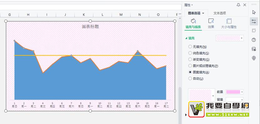 5.删除网格线及主要纵坐标轴,字体选择【华文细黑】,背景填充改为网纹图案填充,前景色为浅紫色,背景色为白色,如下图。