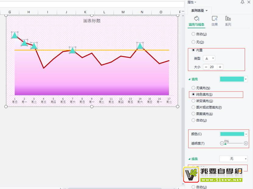 6.点击散点图,【标记】选内置▲,大小20,绿宝石色填充,无线条,添加阴影效果,参数如下图所示。
