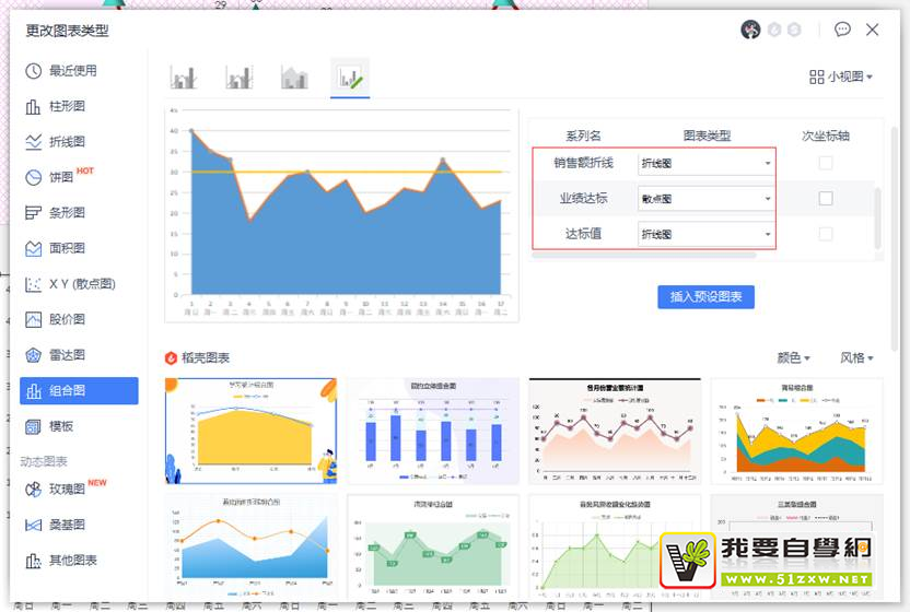 4.点击【图表工具】-【更改类型】功能菜单,在弹出的对话框中点击【组合图】,修改销售额折线为折线图、业绩达标为散点图、达标值为折线图,如下图所示。