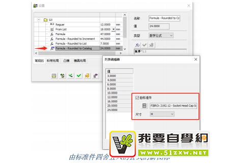 在设置对话框中,可以将公式的结果四舍五入到数值列表中。也可以将该列表与指定标准件特定参数关联。