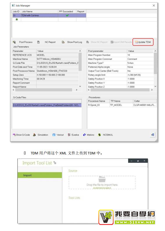可选项:用户可以将选定的刀具的加工时间(后处理之后) 输出至 TDM。TDM 将此信息用于其车间管理。