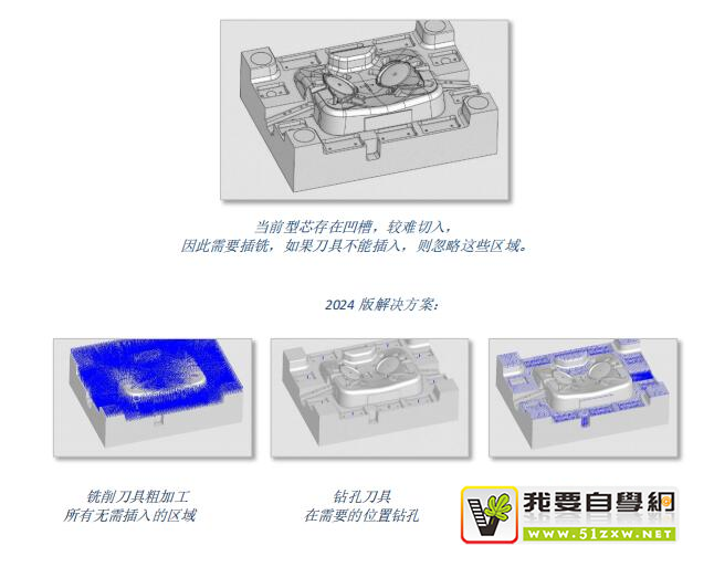 粗加工程序在计算时“知道”这些插入点的位置并可在铣削前根据需要进行钻孔操作。